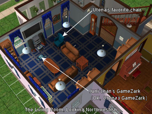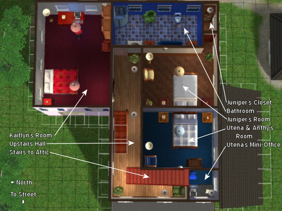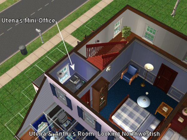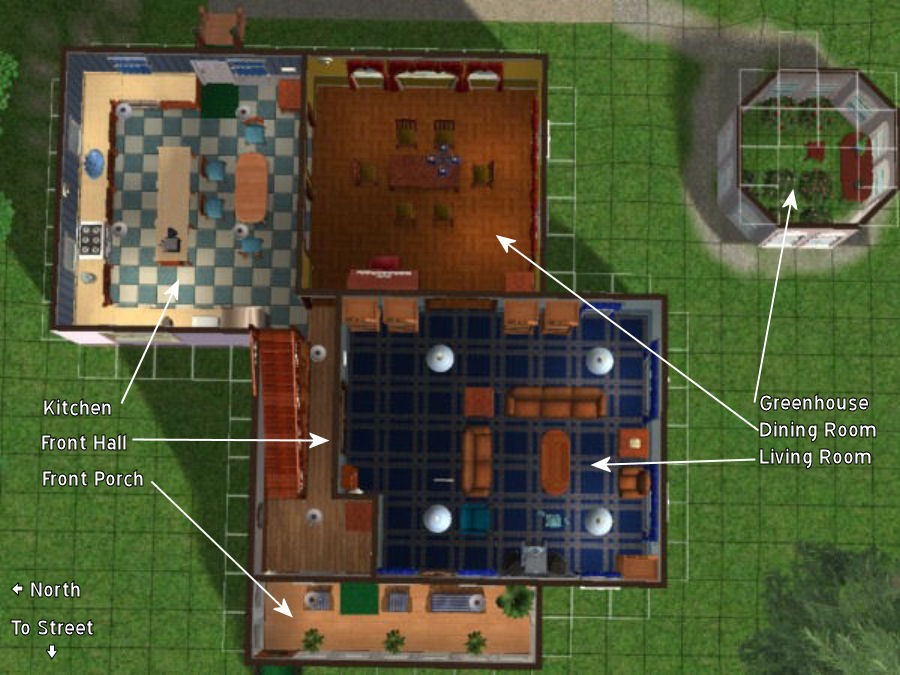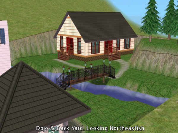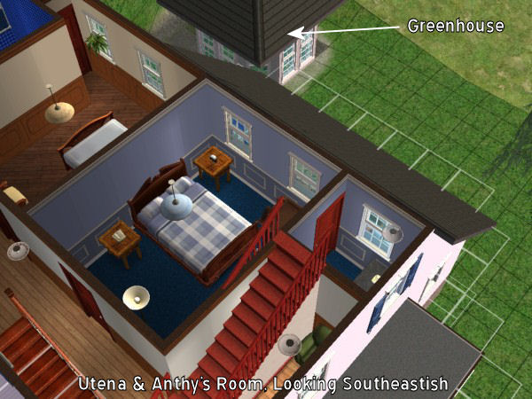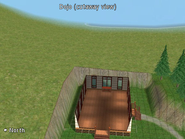 Not shown are the garage (which should be next to the house on the left, or north, side) and a number of features of the back grounds - most notably the barn, the big cherry tree behind the dojo, Anthy's vegetable garden, and the woods which should crown the ridge in back of the house. There just isn't enough space in a Sims 2 house lot for that stuff, plus Sims don't have cars, so there aren't tools for making a proper garage or driveway. Also, Anthy's greenhouse is obviously not show-accurate here. This one is just on the map so you can see where it belongs.