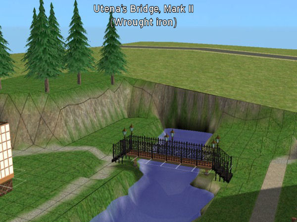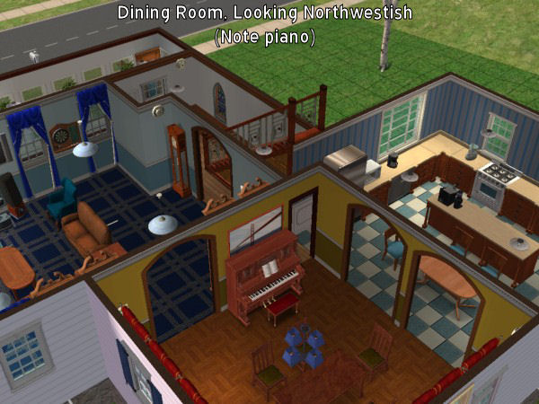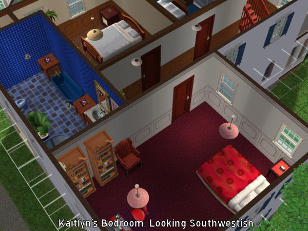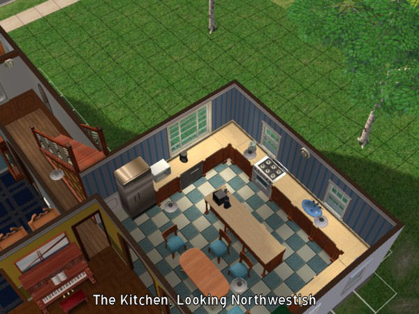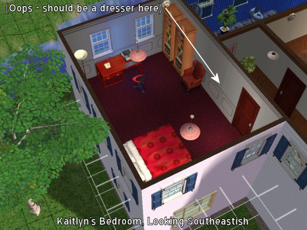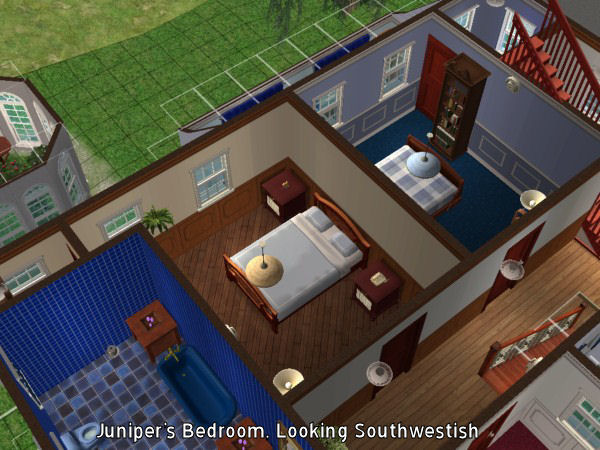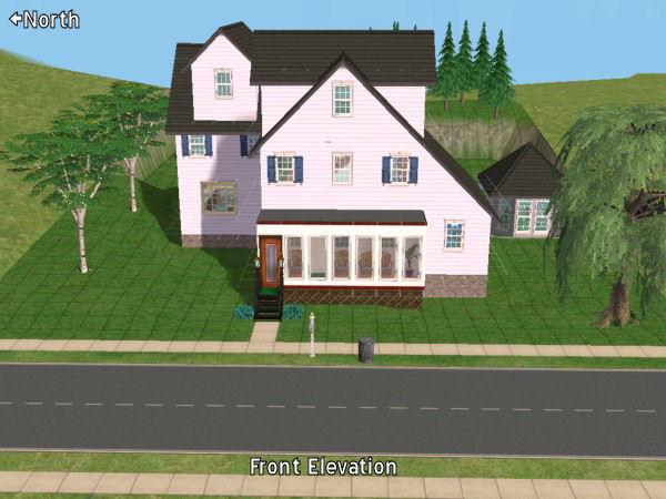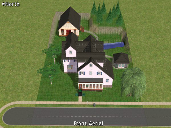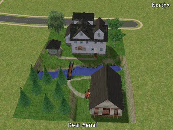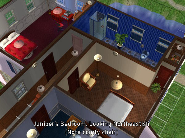 I made this model of the house using the home-building tools in The Sims 2. It's not exact, but within the limitations of the tools, it's a pretty good likeness. It shows the house as it appears in The Kindness of Strangers, after Juniper moves in and the bridge over the backyard stream is replaced.